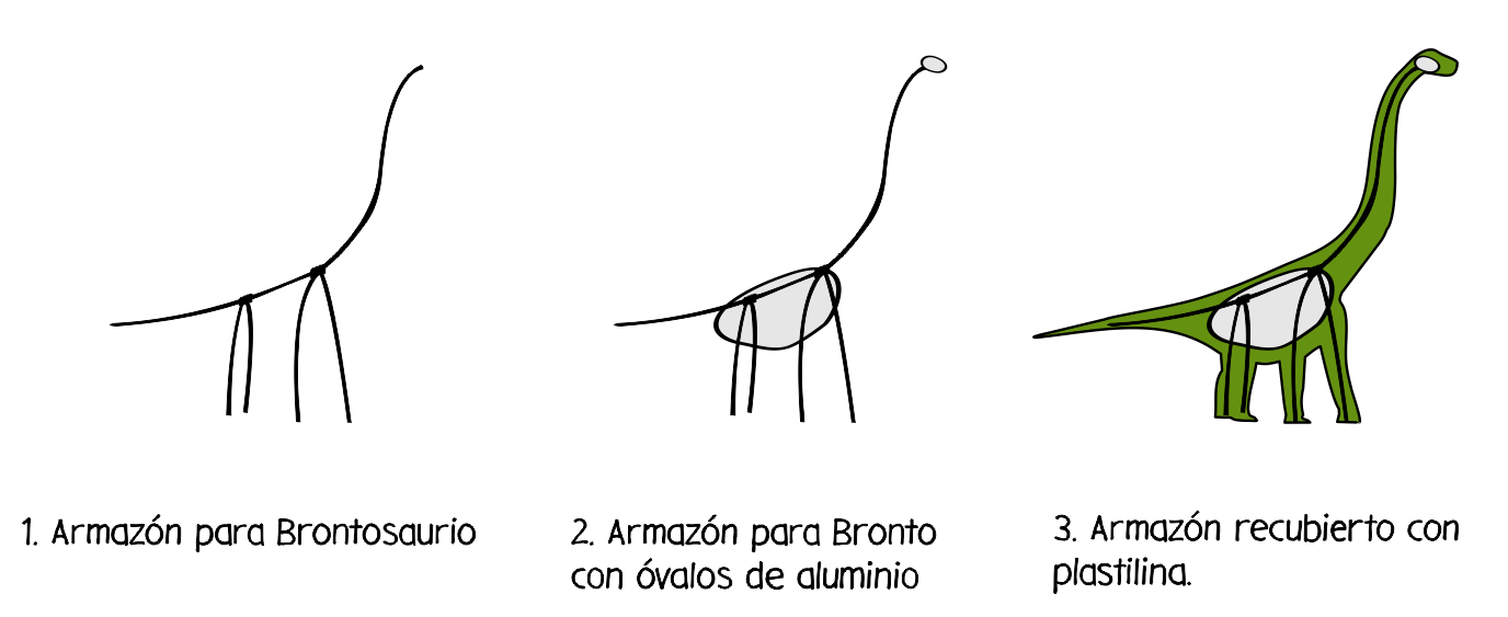 Los dinosaurios, ya sea un T-rex o un branquisario, pueden ser modelados directamente con plastilina. Sin embargo, su forma hará que necesites una gran cantidad de plastilina o algunas partes podrán doblarse e incluso romperse. Por ello, en la prepación puede ser conveniente que armes un armazón de alarme. Ese armazón se puede complementar con papel de aluminio. Dependiendo del dinosaurio que quieras hacer, deberás preparar un armazón distinto. Aquí te mostramos dos, pero tu puedes idear otros. No hay una única manera de construir armazones, asi que prueba y decide cuál es la mejor estructura para tus propósitos.